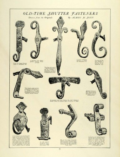 This is an original 1924 halftone print of various antique window shutter fasteners by Albert H. Sonn. Some of the fasteners featured include those in St. Augustine, Florida; Alexandria, Virginia; Middletown, Connecticut; Montgomery Country, Pennsylvania; Peggy Stewart's home in Annapolis, Maryland; Charleston, South Carolina; Chester, Pennsylvania; Germantown, Pennsylvania and St. John's Church in Richmond, Virginia.
